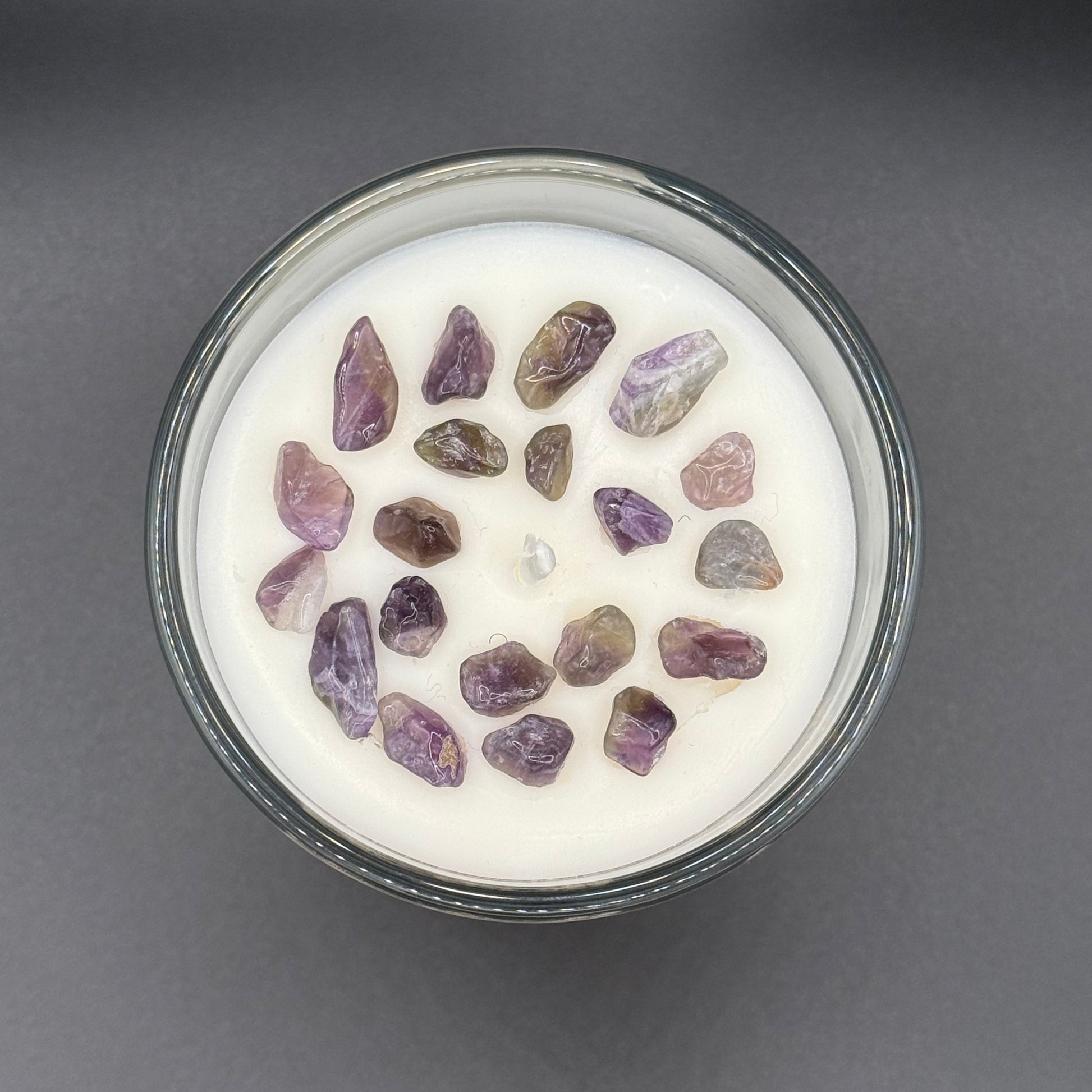 6 oz. Amethyst Candle hand poured with organic soy wax with essential oils of ylang ylang, lavender, & Rose.